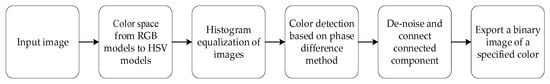 After obtaining the main colors of the three types of traffic signs, namely, the HSV color space ranges of yellow, red and blue, the phase difference method based on the OpenCV to conduct color detection on the alternative area of cropped traffic signs is used in this paper. The color detection algorithm flow based on the phase difference method is shown in Figure 6. The flow can be summarized as follows:
