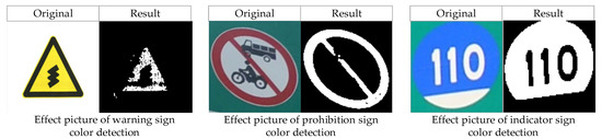 The color detection algorithm based on the phase difference method was used to detect the colors of warning signs, prohibition signs, and mandatory signs respectively. The results are shown in Figure 7.