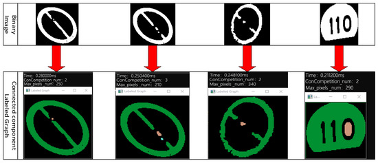 After the color detection of the alternative traffic sign area is obtained by cropping, the binary image of the alternative area will be obtained. However, due to the influence of image noise, there are connected components with different detected color areas in the binary image, so it is necessary to set a certain threshold for the area of the connected component to determine whether the connected component of the detected color is the connected component of the traffic sign color or the connected component of noise in the image. In this paper, the number of pixels in the connected component of the binary image is counted experimentally, and the experimental effect of marking the connected component is shown in Figure 8. In addition, according to the characteristics of the color distribution of traffic signs, the number of pixels in the red connected component is relatively small; therefore, this paper provides the minimum threshold of the area of the connected component based on the number of pixels in the red connected component, which means that the detected results lower than this threshold will be judged as a false detection.