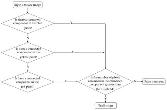 Based on the statistical data of calculating connected components, this paper sets the threshold of the number of pixels of the specified color contained in the connected component in the binary image to 200. Firstly, the specified color detection is conducted on the cropped alternative area of the traffic sign, and the obtained binary image is used as the input of the algorithm for calculating the connected component. According to the characteristics of the color distribution of traffic signs, the connected component of the specified color contains the largest number of pixels in blue, followed by yellow and red. If the connected component with a smaller number of pixels in the three colors is judged first, the number of pixels included tends to be less than the set threshold, which will cause the color that may be upwards of the threshold to fail to be judged. Therefore, our method sequentially judges whether there are blue, yellow, and red pixel-connected components in the binary image, and sequentially determines whether the number of pixels contained in the connected component is above the set threshold. If it is, it can be determined that the detection result of the traffic sign is correct. Otherwise, the detection result of the traffic sign based on the lightweight SSD is false. The specific process is shown in Figure 9.