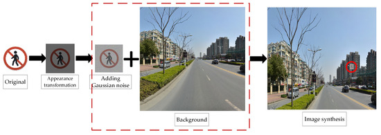 The data enhancement strategy based on image appearance transformation in this paper is to randomly select a traffic sign from the traffic sign standard template library, transform its appearance first, add Gaussian noise, and finally mix the transformed traffic sign with a random background image. The specific experimental effect diagram is shown in Figure 10.