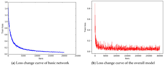 Our model training was conducted in two steps, and the loss change curve during network training is shown in Figure 11. Figure 11a shows the change of the basic network loss. The network was close to convergence when it iterated about 20,000 times. Transfer learning was adopted to train our model on the TT100K dataset; the loss change is shown in Figure 11b. The model was close to convergence at about 5000 iterations, and the model convergence speed is significantly faster.