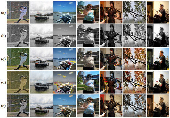 Colorized results on the CAM ablation experiment: (a) Ground truth, (b) Targets, (c) Results using GN only, (d) Results using IN only, (e) Results using AGIN.