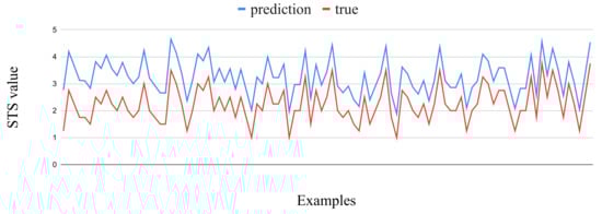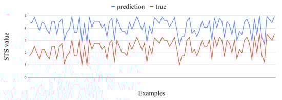 Interestingly, in examples with greater distance between predictions and true values, this difference is almost constant, as shown in Figure 1, and the predictions are greater than the true values, suggesting that the STS predictions of ptBERT-Large fine tuned model are overly confident. As such, we did an experiment subtracting a constant value whenever the difference between prediction and true was greater than a certain value. The best results were obtained by subtracting 0.9 from the prediction, when the difference between the prediction and the true value was greater than 0.5. The resulting MSE was 0.11, as opposed to the 0.47 originally obtained, and the prediction was subtracted in 1014 of the 2448 test examples. As this condition implies knowing the true value, we also experimented with subtracting 0.9 on all predictions, which resulted in a MSE of 0.43.