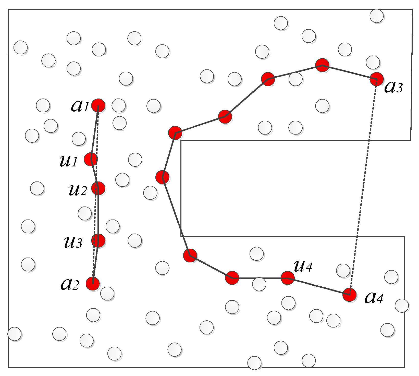 - Find the multi-hop shortest path of the target unknown node to . Record this sensor nodes passed by the path into set .