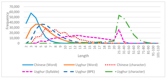 Statistical studies on language granularity have suggested that Chinese organization names are typically condensed into 2–5 words, whereas Uyghur organization names mostly range from 3–8 words (see Figure 1). As shown in Figure 1, there is an obvious difference between the Chinese and Uyghur ON character length distributions. Most of the Chinese ON samples are 3–15 characters long, while the Uyghur names range from 20–80 characters in length. Table 2 demonstrates the proposed segmentation approaches, with the example of “德拉蒙德公司” (CPA: “Dé lā méng dé gōng sī,” meaning “Drummond Corp”), which has the Uyghur translation of “delamond shirkti.”