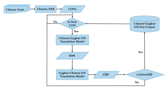 The size of a bilingual ON corpus has a significant effect on model performance in applications, such as machine translation or cross-lingual information processing; however, artificial ON translation, which is required to develop and expand corpora, is time-consuming and tedious. As such, a round-trip Chinese–Uyghur ON translation pair generation system was developed as part of this study to automatically extend a corpus. The quality of these entries was ensured using Chinese–Uyghur ON translations and an Uyghur–Chinese ON model, as shown in Figure 3.