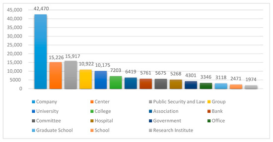 Diagram of the top 15 organization name suffixes, representing business areas and the organization categories.