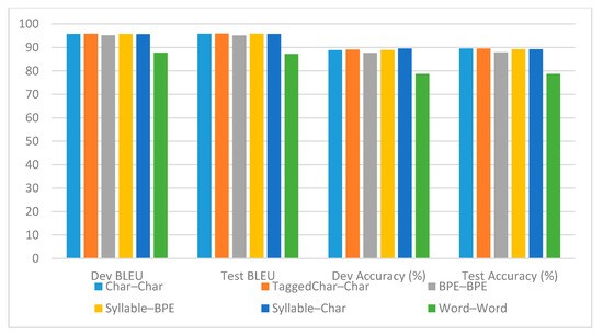 The experimental results shown in Table 7 indicate that the transformer still outperformed the RNN attention-based GNMT system for Uyghur–Chinese ON translation. It can be seen, from Table 7 and Figure 6, that the Uyghur–Chinese ON translation approach based on the transformer also benefited from the characterization and sub-word segmentation. The tagged Uyghur and untagged Chinese character-based model achieved the best result, without a significant difference, compared to other models (except the word-based model). All of the character-, tagged character-, BPE- and syllable-level-based models surpassed the word-based model, with an accuracy increase greater than 10% and an increase in BLEU points of 7.98.