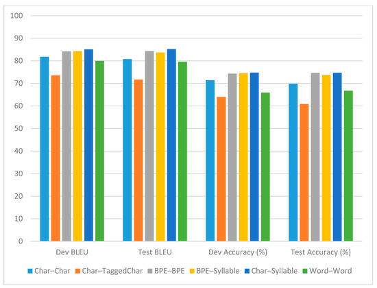 It can clearly be seen that there were obvious performance differences between the various input granularities (see Figure 5). The discrepancies between the word-based models and the Char–Syllable algorithm demonstrate the importance of syllabification for Uyghur ON. There were few differences between BPE–BPE, BPE–Syllable and Char–Syllable. This suggests that a sub-word unit input for Uyghur produced better results for Chinese–Uyghur ON translation.