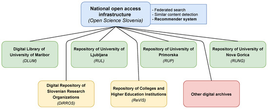 The Slovenian Open Access Infrastructure was established in 2013 and has since enabled the interested parties in Slovenia (researchers, students, companies, and the public) access to the intellectual production of Slovenian educational and research organizations. Simultaneously, it has enabled the researchers to fulfill the requirements for open access to publications from publicly financed research. Structurally (Figure 1), the infrastructure consists of a national portal OpenScience.si [28], institutional repositories for each of the four Slovenian universities (Digital Library of University of Maribor (DLUM) [29], Repository of University of Ljuljana (RUL) [30], Repository of University of Primorska (RUP) [31], Repository of University of Nova Gorica (RUNG) [32]), a repository for research institutions (Digital Repository of Slovenian Research Organizations (DiRROS) [33]), and a repository for colleges and higher education institutions (ReVIS) [34]).
