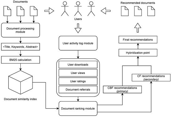 Our recommender system is a cascade hybrid, incorporating content-based filtering as a primary recommendation technique and collaborative filtering as a secondary re-ranking method. It consists of three fundamental modules (Figure 2). The user activity log module provides the information on user activities such as view count, download count, document ratings, and document referrals. The document processing module ensures a unified feature representation of all documents in a triplet representation consisting of a title, keywords, and an abstract. Simultaneously, this module performs the calculation of BM25 values for each document pair, which forms a document index. The latter is a similarity matrix for all documents. Documents are periodically processed as new documents are added to the system daily. This way, the index is kept updated and the recommendations include new documents.