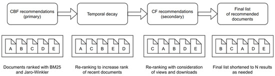 The workflow of our hybrid recommender system consists of four steps (Figure 3). First, the results from our content-based approach are obtained. Second, an exponential temporal decay mechanic (Equation (12)) is implemented to increase the ranks of recently published documents. The parameter controls the exponential temporal decay. The similarity score of the document is multiplied by the temporal decay and the recommendations in the results are re-ranked. Documents contained in the result set are then input into our collaborative filtering approach which re-ranks the results again. Currently, the output result length of our content-based approach is 25 documents. Finally, the list of recommendations is shortened to N documents for better presentation of the result on the web. In practice, we shorten the list to five documents.