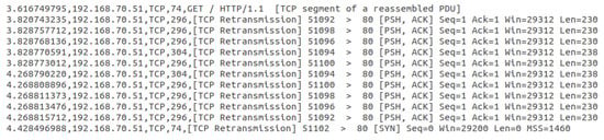We performed the attack analysis using a scenario with a Web server receiving a direct attack. The use of Tshark provides highly detailed information and helps to identify the attacker’s behavior, as shown in Figure 2. During the traffic analysis, we observe that Slowloris uses an initial “GET” containing a reassembled PDU. Then, the following packets have 74 byte size and perform parallel connections to the destination port 80. Furthermore, after establishing a connection with the server, Slowloris sends a sequence of fragmented requests. Using reassembled PDUs, the attack tells the server that more data are coming. These fragmented requests consume the Web server’s resources. Consequently, after sending multiple fragmented requests from different source ports, Slowloris occupies all the available resources dedicated to upcoming connections on the server-side. Therefore, the attack prevents the server from attending to new requests from legitimate users, creating a denial of service.