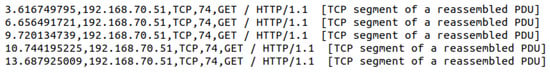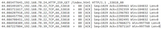 By analyzing the Slowloris traffic and the HTTP legitimate traffic described in Section 3, we observed that after establishing the connection, the first request to the Web server is not a default GET request; see Figure 4. This behavior occurs because Slowloris does not send complete GET requests. Thus, Slowloris avoids the request conclusion by inserting a “∖n” at the request data’s end. Conversely, legitimate requests send a complete request within the packet. Furthermore, the Slowloris traffic requests use a TCP value in the fourth traffic logs column, thereby differentiating from the legitimate requests that present the same column’s HTTP value.