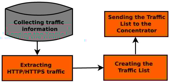 Figure 6 presents the collection module (CM) flowchart working on the Web server. Initially, the CM collects traffic logs from HTTP requests. After that, it collects the traffic for five seconds. We choose to collect for 5 s because it was enough to collect relevant traffic information without delaying too much to send the traffic list to the Concentrator. In previous tests, a number between 5 and 7 s did not produce a relevant delay. Additionally, it provided enough time to detect and stop the attack before it depletes the server resources. It is essential to mention that this traffic collection occurs continuously. Therefore, at every 5 s, a new traffic list is created and sent to the Concentrator. After that, it creates a traffic log using the tool Tshark. We set Tshark to convert the received traffic to a pcap extension. Subsequently, CM removes irrelevant information concerning HTTP connections and creates the traffic list. Next, CM sends the traffic list to the Concentrator.