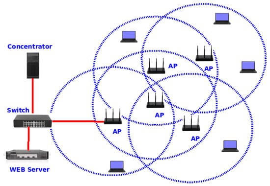 The connection between the APs utilizes the IEEE 802.11b/g/n 2.4 GHz creating an ad-hoc WMN. The WMN uses the Optimized Link State Routing Protocol (OLSR) []. The parameters of OLSR used were the following: the interval between HELLO messages was equal to 1.5 s, and the Link state messages were sent every 5 s. The multipoint relays use these Link state messages to calculate the topology map. Hence, we installed two packages in the wireless routers: Openwrt_luci_app_olsr and Openwrt_luci_app_olsr_services. These packages permit the creation of ad-hoc routes using the OLSR protocol. We also use the Expected Transmission Count (ETX) metric to optimize the routing selection. The ETX metric can be defined as the expected number of transmissions required to deliver a packet over a given link []. This metric calculates the weight of a given route by using the sum of all ETX weights. Each ETX weight informs the value for every link on a path. This ETX weight guarantees the objective proposed by the metric of choosing routes that decrease the total number of retransmissions at the link level along the way. We also use the following hardware: