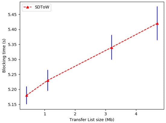 In this experiment, we varied the amount of HTTP traffic to change the traffic list size. By changing the traffic list size, we analyzed its impact on the total blocking time. The traffic list size directly influences the transfer list time () and the traffic list processing time (). Therefore, by increasing the time to send and process the traffic list, this consequently raises the total blocking time (); see Figure 8.