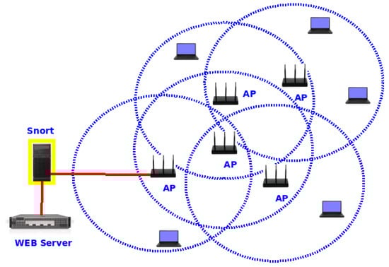Figure 10 presents the Snort scenario gathering information from the incoming traffic. We placed Snort between the AP and the Web server. We designed this scenario to permit a fast attack response by Snort. Therefore, it can block the attacker whenever the malicious traffic matches the anti-Slowloris rule.