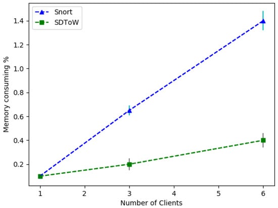 Memory consumption comparison between Snort and SDToW.