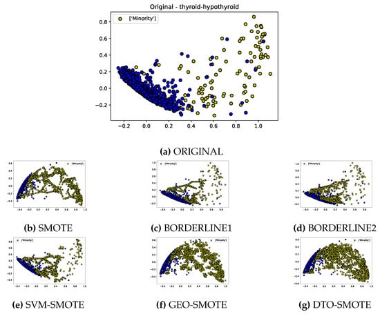 Figure 2 illustrates this bias. This figure is a two-dimensional projection for a binary class (thyroid) data set(a), alongside their over-sampled versions using SMOTE (b), Borderline SMOTE with its two versions (c) and (d), SMOTE-SVM (e), and Geometric SMOTE (f), as well as our proposed DTO-SMOTE algorithm (g). Observe that the synthetic instances generated by SMOTE, Borderline SMOTE, and SMOTE-SVM follow a chain trail. For Borderline and SMOTE-SVM, these trails concentrate near class boundaries.