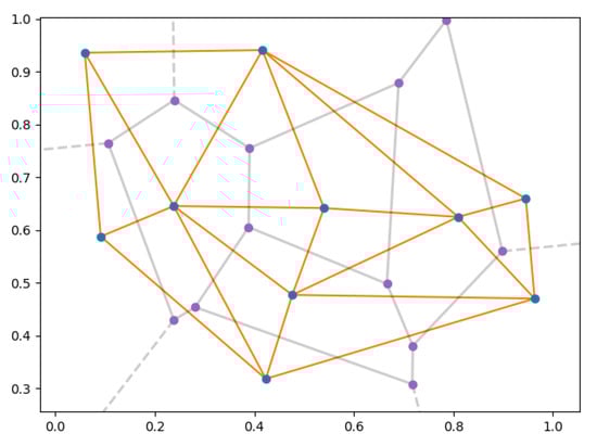 The Delaunay tessellation has some interesting properties. In the plane, the triangulation is a maximum planar graph and completely divides the space by triangles (if no four points are co-linear). The center of the circumsphere of a Delaunay polyhedron is a vertex of the Voronoi cells. Figure 3 shows an example of a Voronoi diagram (in grey) and a Delaunay tessellation (in orange) for a two-dimensional space. The closest neighbor to any point lies on edge in the Delaunay triangulation, as the nearest neighbor graph is a subgraph of the Delaunay triangulation. This unique set of neighboring points defines the neighborhood of the point and represents a parameter-free definition of a point’s surroundings. The triangulation maximizes the minimum angle of the triangles, avoiding the occurrence of silver triangles. A silver triangle is a triangle with one or two extremely acute angles, hence with a long/thin shape. Intuitively, the Delaunay tessellation is a group of simplices that are most regularized in shape, compared to any other triangulation type. Delaunay tessellation may be used to approximate a manifold by a simple mesh [,], in computational geometry [,], and planning in automated driving [], among others.
