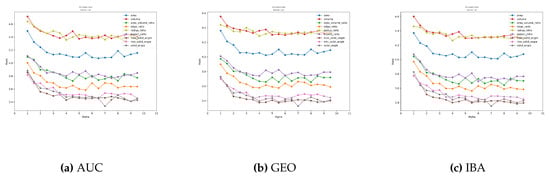 Figure 5 depicts the influence of this parameter. The graphs show the variation in rank as a function of the parameter for each tetrahedral quality measure, averaged over all the data sets. Results are homogeneous among the different metrics (AUC, GEO, and IBA for binary data sets). As can be seen, the quality measure based on the solid angle produces better results. Furthermore, larger than four also produces good average results.