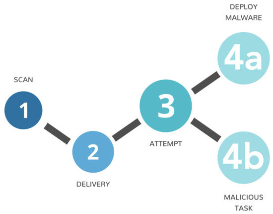 A sample anatomy of a cyber attack was also presented by Bou Harb et al. in their paper about cyber scanning [27]. The anatomy of the attack consists of the following steps—cyber scanning, enumeration, intrusion attempt, elevation of privilege, performing a malicious task, deploying malware/a backdoor, deleting forensic evidence, and exiting.