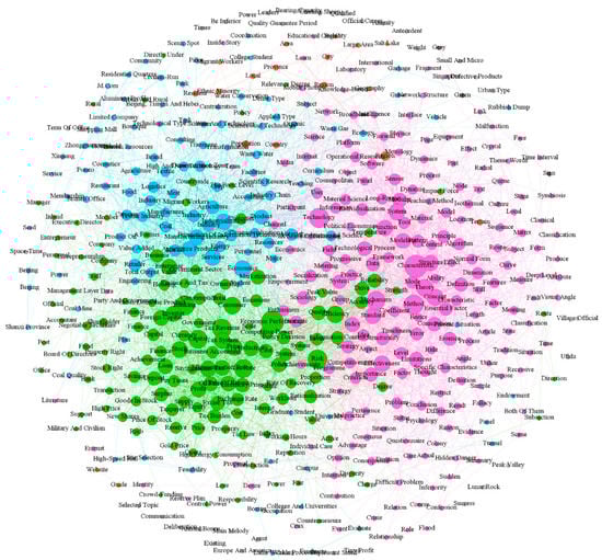 The Chinese Wikipedia corpus is the complete knowledge set under the “Internet+” environment, using the PyNLPIR (Chinese word segmentation system) provided by the Chinese Academy of Sciences for word segmentation and the Word2Vec model for semantic modeling []. In this study, the skip-gram model in Word2Vec is used for training. The dimension value of the word vector was set to 200. For the power-law distribution of the word frequency in the corpus, the low-frequency words with a word frequency of fewer than five times were filtered to reduce the size of the knowledge collection network.
