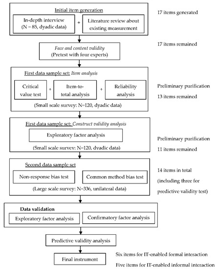In order to validate the measurement of IT-enabled formal and informal interaction in contemporary Chinese contexts, this study employs both qualitative and quantitative research designs following the procedures provided by Churchill [44]. Figure 1 presents the specific methodological steps, including (1) the preliminary item pool is derived by juxtaposing the findings from in-depth interviews and the existing items measuring IT-enabled formal and informal interaction; (2) four experts were invited to check the face and content validity of the preliminary items; (3) initial data were collected and the items was preliminarily purified via item analysis (including critical value test, item-to-total analysis and reliability analysis) and then construct validity analysis (i.e., exploratory factor analysis); (4) a second round of data were collected for further purification and refinement and the dataset was checked for non-response bias and common method bias; (5) the final instrument is derived after exploratory factor analysis (EFA), confirmatory factor analysis (CFA) and predictive validity analysis for checking the validity and reliability. The following section provides more details.