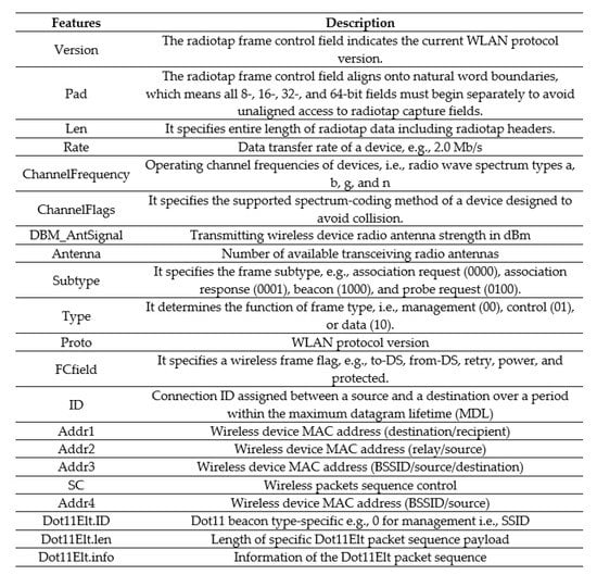 24], an encrypted wireless network packet can still be analyzed using the link-layer header information. In this paper, we used the same approach to extract features from wireless network packets.