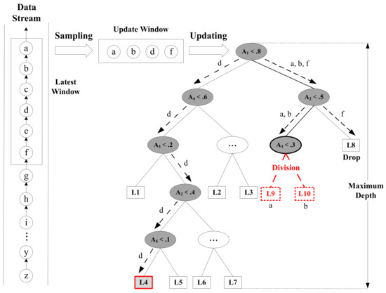 The instances in the buffer enter the tree-building window and form the dataset , which is used to create new trees (see Section 3.3.2). In the same way as in the initial training process, we sequentially perform sampling with replacement, random selection, and partitioning to build a new random binary tree using . Finally, the building window will be emptied.