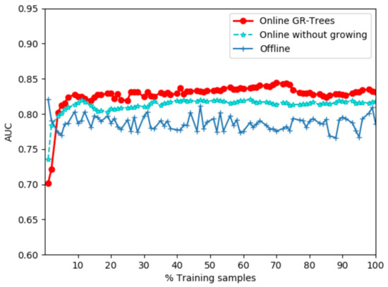 We used the SWaT network traffic dataset to evaluate the detection performance of GR-Trees, its offline counterpart [20], and an online model without growing that only constructs new trees to replace old ones based on mass weight. For this experiment, we set the number of trees to be 100 and the subsample size to be 256. We set and for the streaming update. Figure 3 compares the fluctuation of AUC scores for these three methods as the number of training samples from the SWaT dataset changes. We can see that the overall AUC scores of GR-Trees and the online model without growing are higher than the offline model, which illustrates the importance of gradually updating the model. In the initial stage, GR-Trees does not perform as well as the online model without growing. This difference is caused by the randomness of selection of features and feature values during tree construction. As the number of training samples increases, that is, the data stream is successively obtained, the positive effect of online tree growth gradually becomes apparent, leading to the AUC score of GR-Trees gradually exceeding the latter and continuing to maintain this advantage.