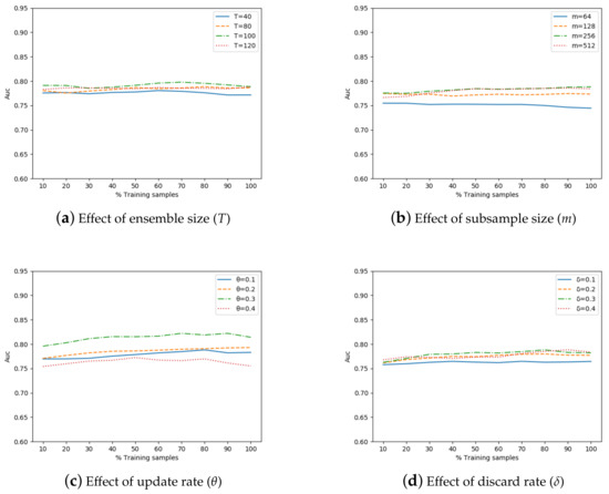 In Figure 4a, we show the change in the AUC score when the ensemble size (T) is 40, 80, 100, and 120, respectively. The increase in ensemble size within a certain range is conducive to improving the AUC score. However, when it exceeds 100, the AUC score does not change obviously. In terms of experimental results, we shall use as the default value in our experiment.