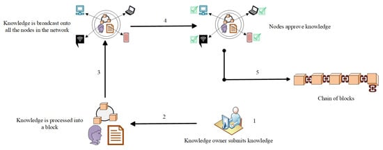 Blockchain has been a revolutionary paradigm in systems of record and it has been seen as the emerging technology in industry and the research community. The technology plays a significant role in controlling, monitoring and, most importantly, securing systems [,,,,]. With the facilitation of data sharing and other resources, including knowledge, its combination with other systems enable the automation of time-sensitive workflows in a cryptographic manner. Knowledge shared/given by their owners is always cryptographically proofed by the signature of the sender who holds a unique key pair, and therefore the integrity and authentication of the knowledge is guaranteed. Moreover, all transactions on the knowledge are recorded in a distributed ledger and can be securely traced. As a distributed, programmable and encrypted database for the transfer, storage, protection and access of knowledge from one location to the other, and the provision of a high level of security, the information or knowledge stored in the blockchain cannot be re-written or modified. This design makes the blockchain capable of having a permanent historical record. Although the blockchain can be seen as a remedy for securing most systems including KMSs, and preserving privacy of the knowledge, there are many research challenges that prevent its full incorporation.