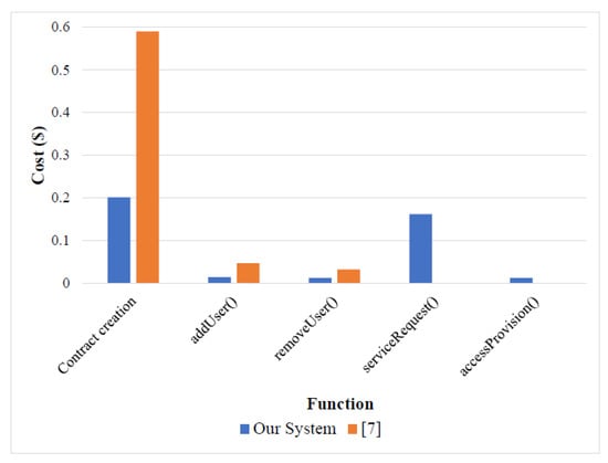 The gas costs of operations (in Gwei) ertr calculated since each function on the blockchain is fixed. The efficiency of our system esd analyzed by comparing the results obtained with the ones obtained in [], regarding the common parameters. Table 1 illustrates the cost of executing the various functions. There are relatively low costs for all functions, with an average cost of $0.0808. The costs are as a result of the prototypes deployed on our blockchain system, and, by using optimization methods, the costs can be reduced. However, these costs are significantly lower compared to setting up and maintaining a private knowledge. serviceRequest and accessProvision are not functions in [], and hence there are no values for them in Table 1.