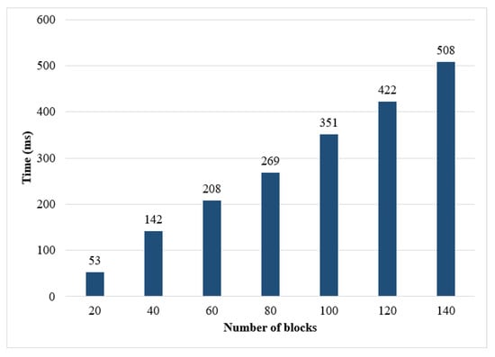 In Figure 5, we demonstrate the scalability of our blockchain system. For as low as 53 ms, our blockchain system can process 20 requests made by knowledge users, and 140 requests can be processed within 508 ms. From the test results, it was observed that there is a steady increase in transaction processing. This increase can be attributed to the fact that the transaction path and information or knowledge package flow path are separated (i.e., it reduces the delay of transaction processing). By implication, while transactions are broadcast amongst all nodes in the network, the knowledge packets are transmitted directly towards its destination along optimal paths as specified by a routing protocol such as Open Shortest Path First (OSPF) []. Moreover, the threshold was set to 140 transactions per second to ensure that the rate of transaction processing remains at a desirable level, which helps to maintain the scalability of our framework.