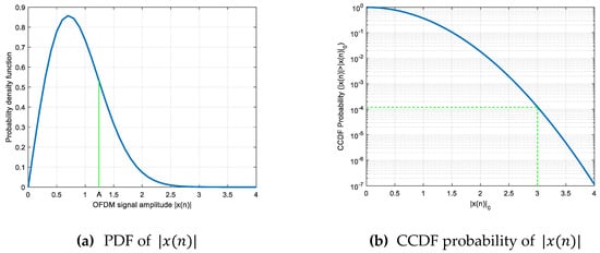 The discrete time-domain OFDM signal can be written as , where and respectively denote the real and imaginary parts. Generally, the input data symbols are statistically independent and identically distributed random variables with zero mean and variance of []. According to the central limit theorem, and are Gaussian variables with zero mean and variance . Therefore, the amplitude follows the Rayleigh distribution [], and the probability density functions (PDFs) can be written as