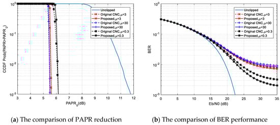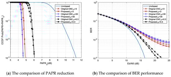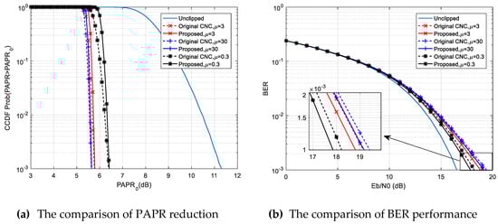 The evaluated OFDM systems in Figure 5 and Figure 7 adopted the same modulation scheme and different clipping ratio, and they achieved an equivalent PAPR reduction as well when the proposed method adopted properly selected sets of α and μ. It can be seen from Figure 5b and Figure 7b that in both cases the proposed method has an improvement in BER performance compared to the original CNC method, and the improvement in Figure 7b is more obvious. This indicates that the proposed method has a more significant improvement compared to the original CNC method in the system with lower clipping ratio.