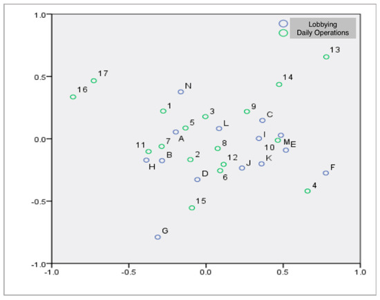 Correspondence analysis of the daily operations of civil society organizations and lobbying activities. Key for Figure 2 (A = Petition, B = Signature-collecting campaign, C = Public comments, D = Flyer distribution and poster posting, E = Expressing opinions through website, F = Expressing opinions through social media, G = Demonstrations, H = Collective bargaining, I = Provide information for media, J = Public opinions through traditional media, K = Expressing standpoint through press conference, L = Forming alliances with other organizations, M = Forming alliances with foreign organizations, N = Having nothing to do, 1 = Council, 2 = Make and send newsletter, 3 = Holding the website, 4 = Social media, 5 = Sharing new knowledge workshop, 6 = Symposium/Seminar, 7 = Special events such as festival, 8 = Collect and provide information, 9 = Provide the special knowledge and skill, 10 = Research/Investigations, 11 = Member inter-communication, 12 = Product and sell the manufactured goods, 13 = Workshops with an admission fee, 14 = Introduction of experts, 15 = Consultation/Counselling, 16 = Outsourcing of public facilities, and 17 = Operation and run the facilities).
