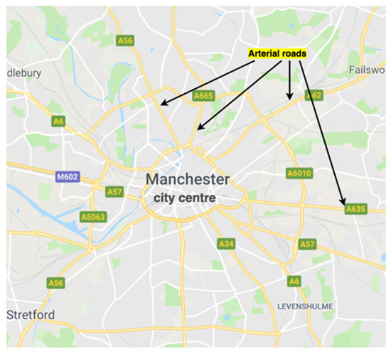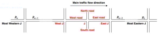 Figure 1 shows the map of the city of Manchester and highlights some arterial roads along with the location of the city centre. A simplified version of an arterial road is illustrated in Figure 2 where the main traffic flow direction indicates the prioritized direction (used by vehicles to exit the city centre). The labels in red are the description of roads and junctions relative to the junction J (in the centre). These terminologies will be used throughout the rest of this paper.