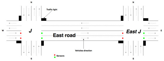 In this paper, we will only consider 2-lane roads, hence the road networks architecture adopted requires four sensors per junction as illustrated in Figure 3, which depicts the deployed sensors locations in two adjacent arterial junctions. We can see that the red sensors detect vehicles coming from the West and going toward the junction whereas the green sensors detect vehicles leaving the junction and moving toward the East. The number of vehicles on the road between two adjacent junctions (East road relative to junction J) is the difference between the number of vehicles that have passed over the green sensors of the junction J and the number of vehicles that have passed over the red sensors of the East junction.