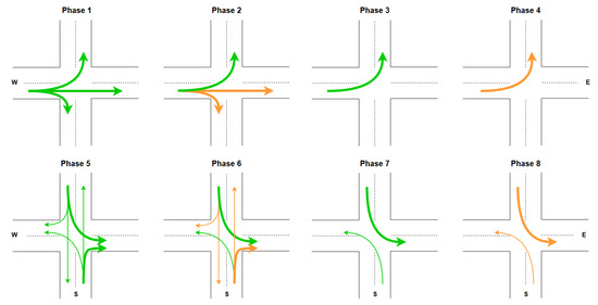 All Traffic Lights (TLs) use a cycle of 8 different phases as illustrated in Figure 4. In this figure, the green curves show the allowed vehicle movements and the amber ones signal the end of the last phase. Forbidden movements (red signal) are not displayed for simplicity purposes. Only vehicle movements heading to the East road are represented to keep the figure clear. This cycle is the one commonly used in traffic light controllers in main roads because it minimizes the risk of collision while allowing any possible movement.