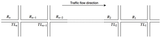 This section describes how synchronization between two adjacent TLs is achieved. Let us consider a road network with n junctions (, , …, ) as illustrated in Figure 6. is the most Eastern traffic light and is the most Western one. The TLs are all linked together by n − 1 road segments (, , …, ), with being the road segment between and .