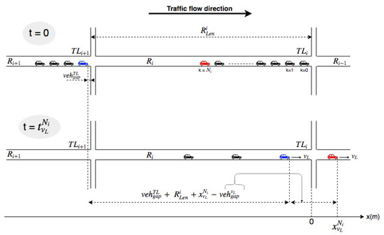 Figure 7 illustrates two snapshots of two adjacent junctions of a road network. The top figure shows the road network state at the time when switches to green (i.e., ) whereas the figure at the bottom illustrates vehicles positions and speed at the time . This is the time when the red vehicle reaches the speed limit . From Equation (21) we know that the red vehicle is located at the position . This is not the distance traveled but rather the position in the x-axis as shown in Figure 7. The blue vehicle needs to reach the red one while traveling at a speed of leaving a gap of between the two of them. The gap mentioned here is the distance between the front of the vehicle ahead and the front of the vehicle behind. This gap can intuitively be retrieved from the knowledge of the initial gap when both vehicles are stationary , the length of the vehicles and the interval between the time when each vehicle starts moving :