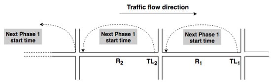 In the previous section, we have shown how two adjacent TLs can be synchronized. This section will build on that development and show how synchronization on a road with multiple junctions is achieved. When there are multiple junctions on the road, the synchronization across the road is done by synchronizing two adjacent TLs in cascade starting from the most Eastern ones. As shown in Figure 8, which leads the synchronization process signals to its next phase 1 start time before reaching it. From the moment receives that information, it computes its next phase 1 time to synchronize with . At the time knows when it will switch to phase 1 in the next cycle, it communicates that information to which in return does the same thing. This process is continued until the most Western TL is reached.