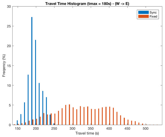 Figure 12 depicts the variation of the achieved trips duration (i.e., travel time) in fixed and synchronized TLCSs. The results shown are grouped by 10 s interval for a value equals to 3 min. We can observe that our synchronized ATLCS has much higher number of shorter trips (lower than 250 s) compared to the fixed time TLCS which has a significantly higher number of longer trips (up to 500 s). This is due to the fact that the synchronization process at arterial roads allows a large portion of vehicles to reach their destination with lower number of stops (i.e., a reduction in the ‘stop and go’ phenomenon), hence the faster progress towards their destinations.