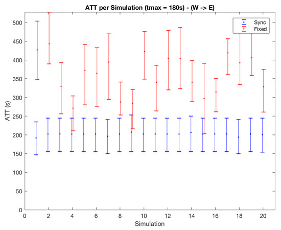 Figure 13 shows the travel time achieved per simulation for = 3 min. The dot in the middle of the vertical lines represents the ATT per simulation whereas the line at the top and bottom of the vertical lines represent the maximum and minimum travel time for each simulation. We can see that for our synchronized ATLCS (in blue) the average, minimum and maximum values of the travel time are almost the same (minor variation observed only) for all simulations whereas the values for the non-synchronized fixed time TLCS vary a lot across the different simulation runs. The reason behind such variation is the lack of synchronization as well as the varying number of vehicles queued behind the TL, at each simulation run, leading to a significant variation in the number of stoppages, avoided in our ATLCS, and thus the increase in travel time.