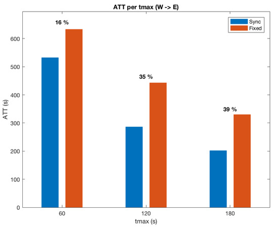 Figure 14 illustrates the impact of the value on the achieved ATT. The percentage values on top of the bars represent the improvement achieved by the synchronized ATLS compared to the non-synchronized fixed time TLCS. We observe that the highest improvement (39%) is achieved for a value of 3 min. Notice that the substantial benefit of the synchronization is achieved for higher values of because this allows a large number of vehicles to travel a long distance without having to stop as the green wave lasts for a longer period compared the scenarios when is set to 1 and 2 min.