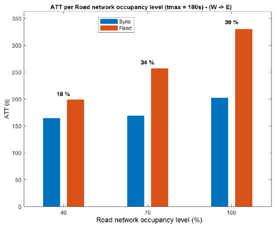 All the results discussed so far were for a highly congested road network (i.e., the road is used to its full capacity). Figure 15 shows the ATT achieved for different levels of road network occupancy. A road network occupancy level of 100% means that the rate at which new vehicles are added to the road network is the maximum (about 1 vehicle every 2.4 s per lane). This should be interpreted as a highly congested road network. The highest improvement (39%) occurs when the road network occupancy level is maximal.